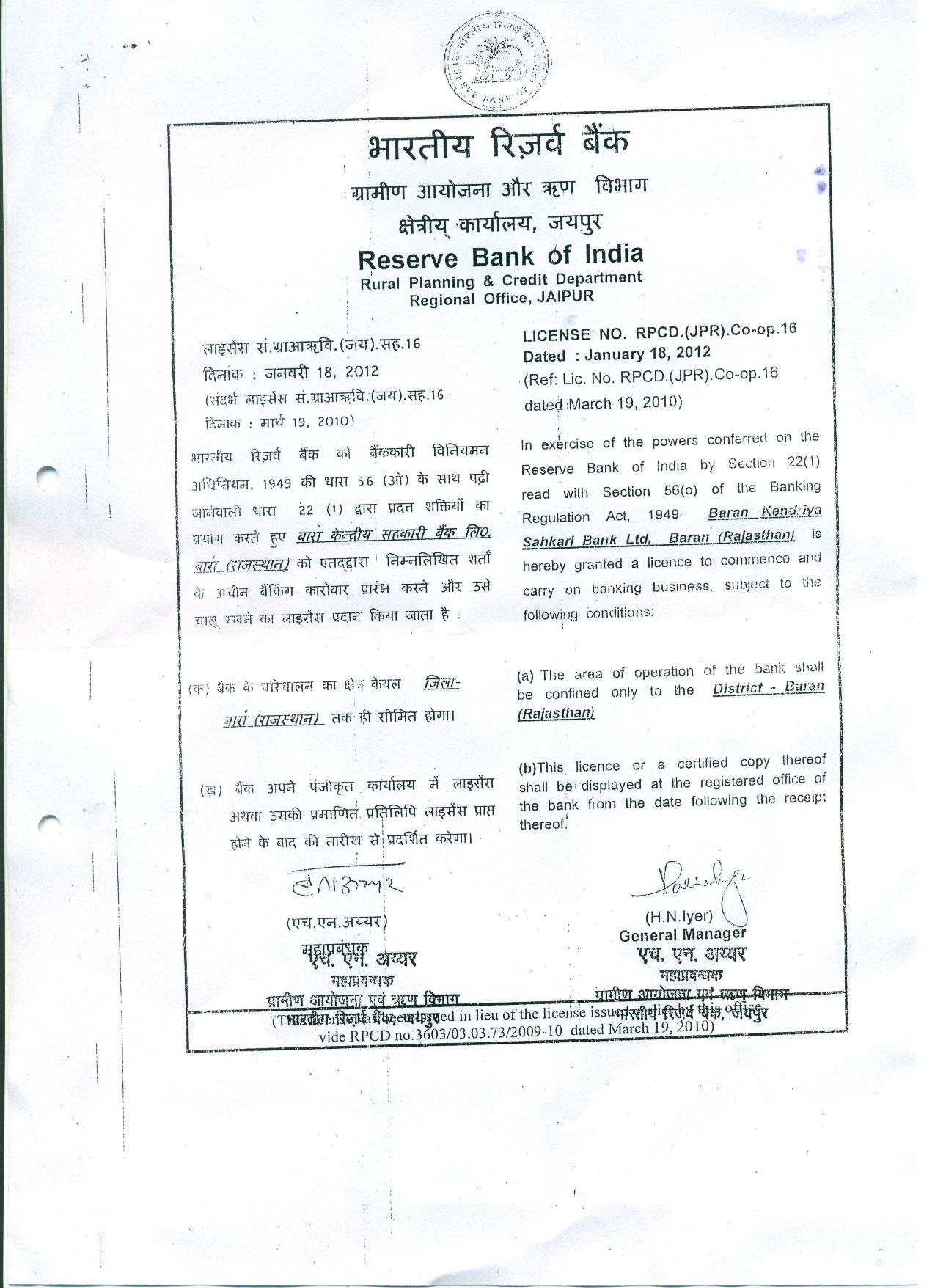 License No. RPCD.(JPR).Co-op.16 Dated January 18,2012